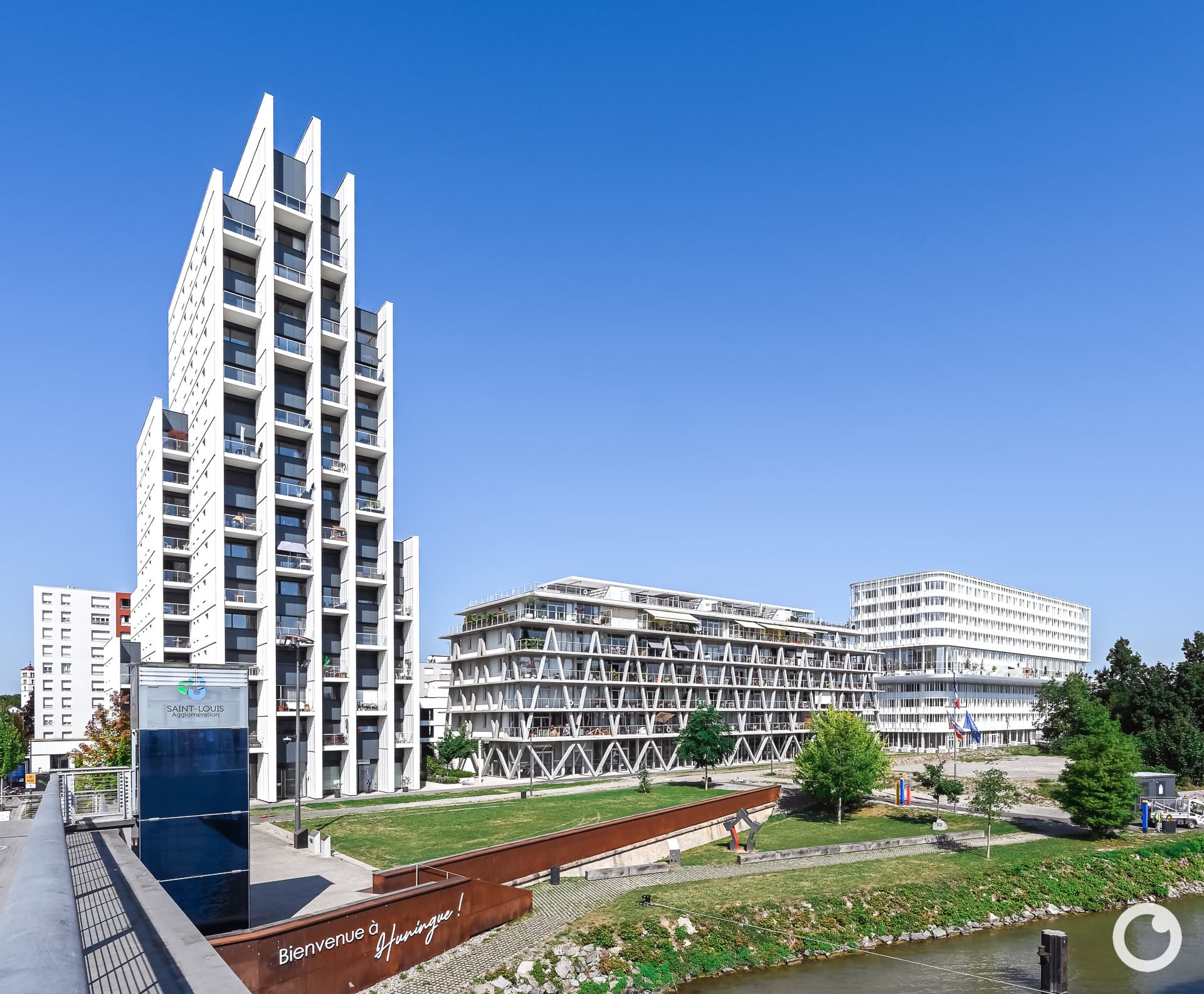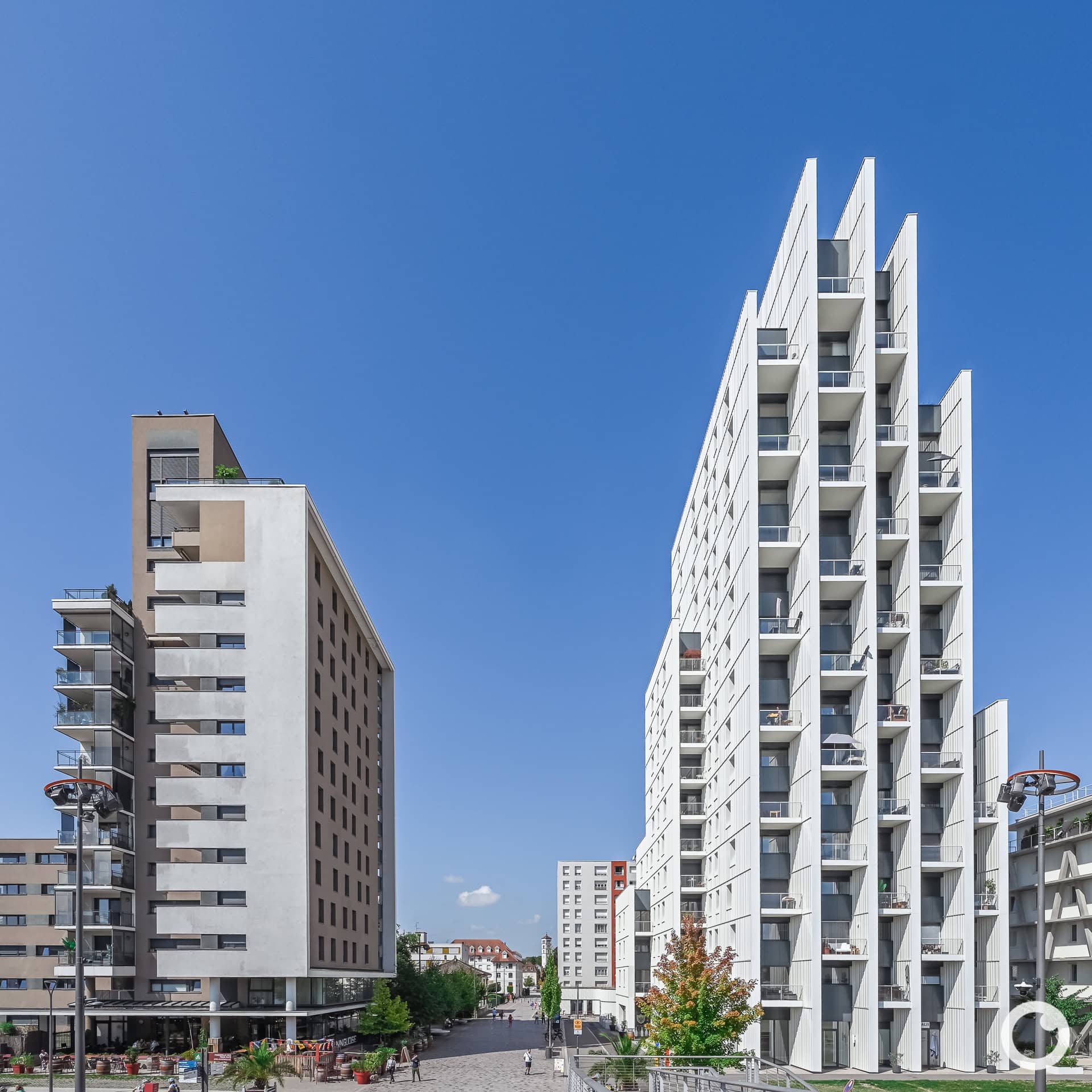 Zwei Türme, zwei Gesichter: Der Bogen Tower von PietriArchitectes erhebt sich wie ein skulpturaler Pfeil am Rhein und markiert mit seiner vertikalen Fassade den Auftakt des neuen Quartiers Les Jetées in Huningue. Großzügige Glasbalkone öffnen den Blick weit über Fluss, Stadt und Dreiländereck. Cap Plein Ciel, entworfen von AEA Architectes, setzt mit seinen horizontal gegliederten Balkonen und der offenen Gestaltung einen Kontrapunkt und prägt bereits seit 2010 die Rheinfront.