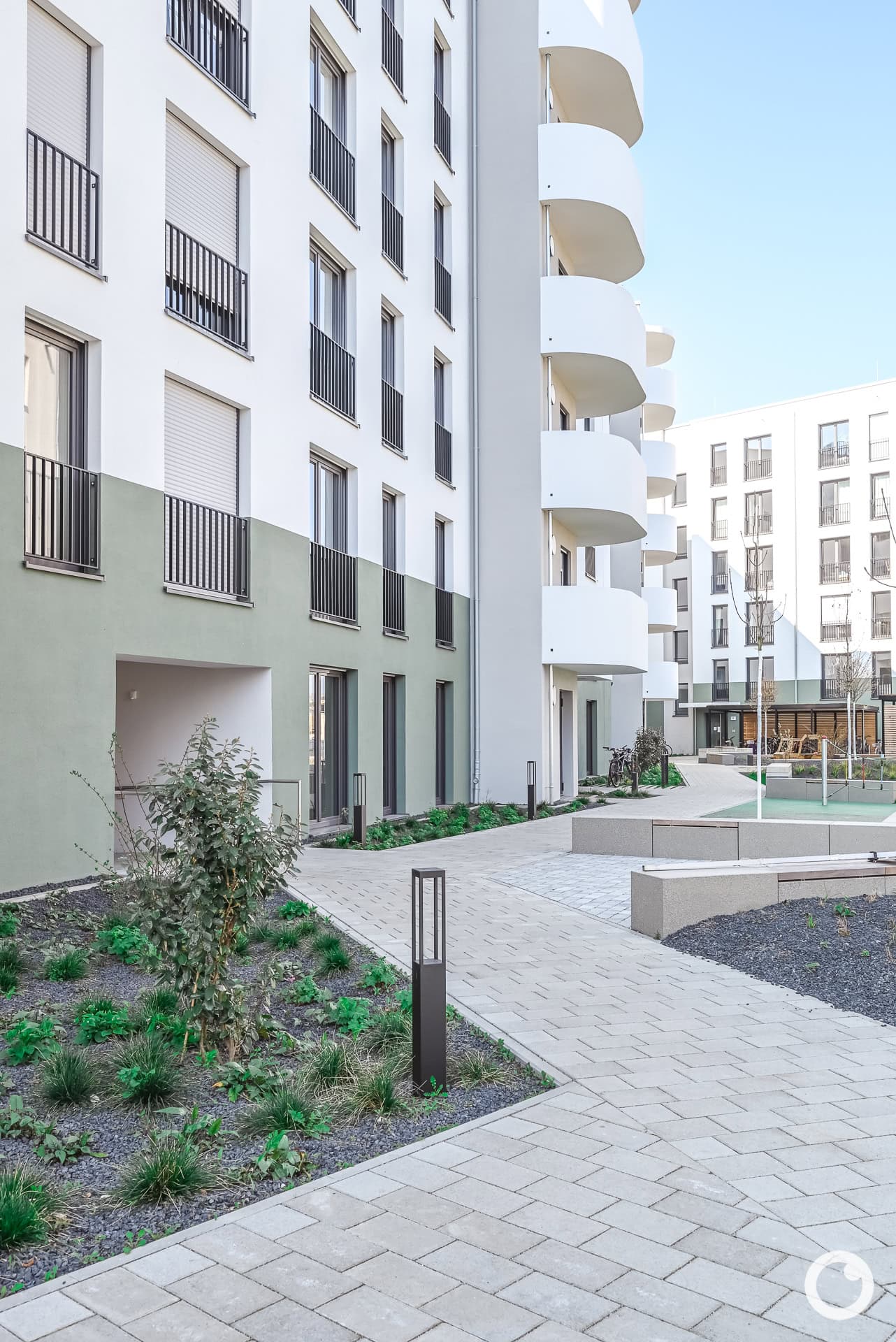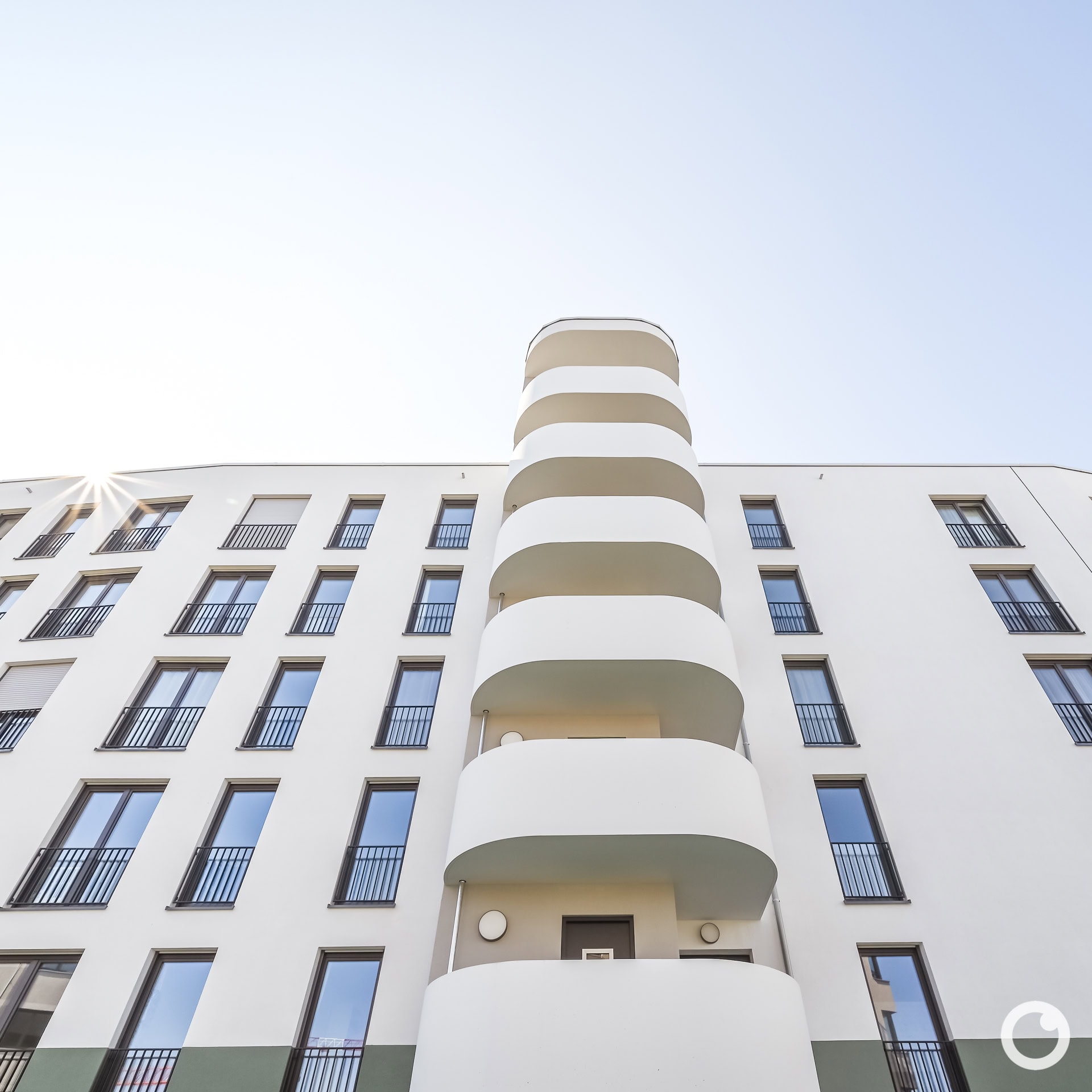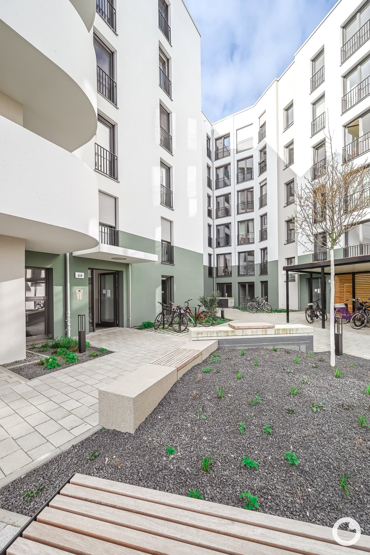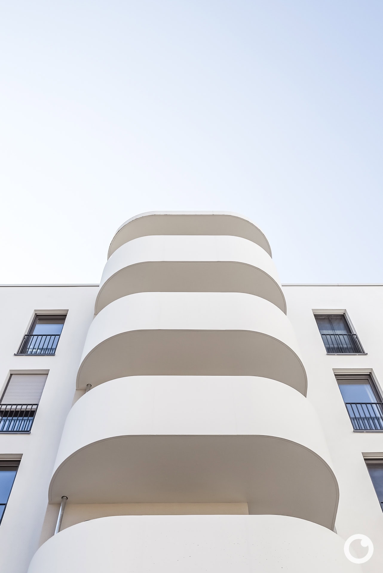 Die Wohnanlage besticht durch ihre klare, urbane Architektursprache und die markant geschwungenen Balkone, die an die Formensprache der 1970er-Jahre erinnern – zugleich modern interpretiert. Das Zusammenspiel von weißen Fassadenflächen, feiner Gliederung und zurückhaltenden Farbakzenten vermittelt eine elegante Ruhe. Im Innenhof öffnet sich der Bau zu einem hellen, gemeinschaftlich nutzbaren Raum, der Aufenthaltsqualität schafft und den Bewohnern geschützte Freiflächen bietet.