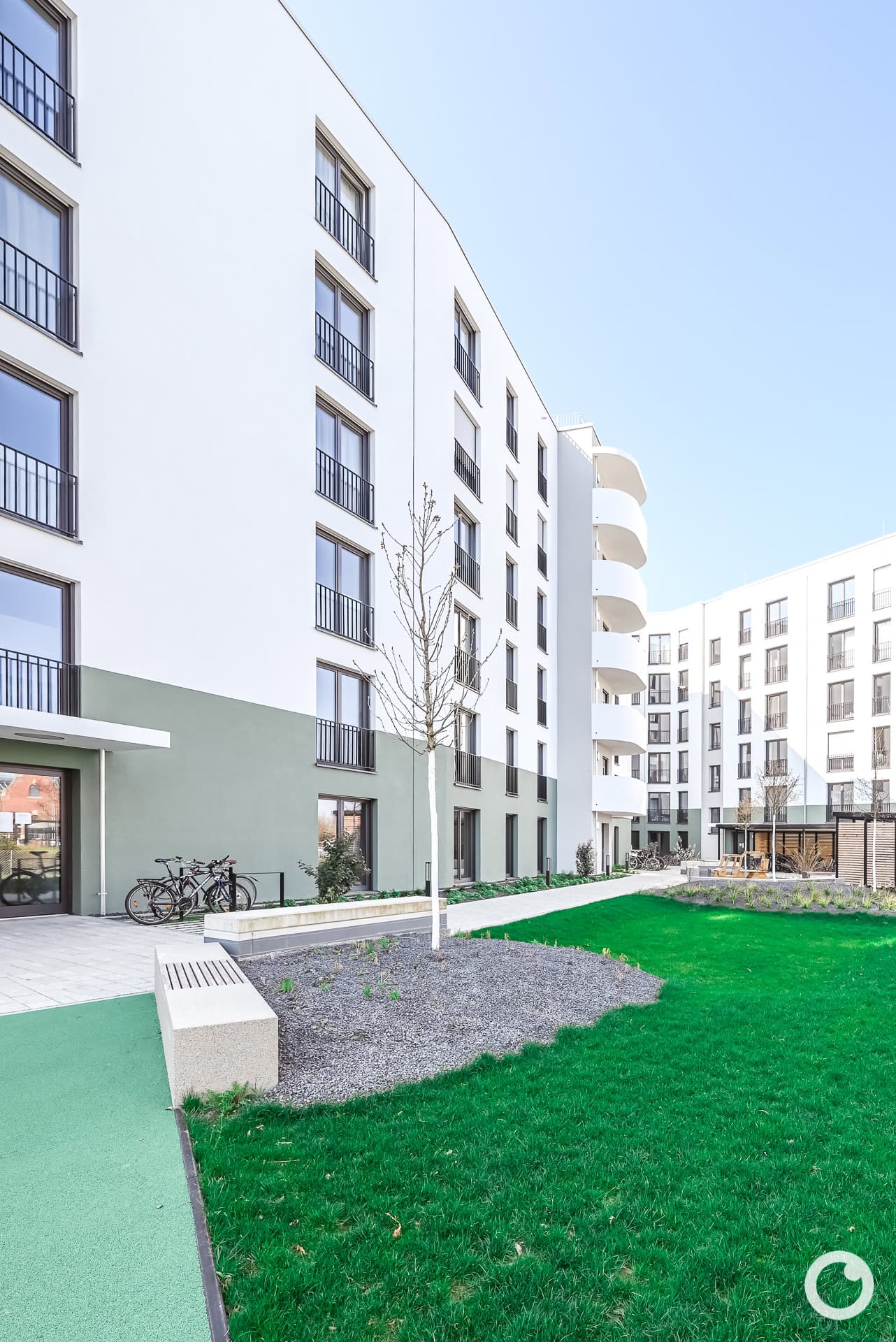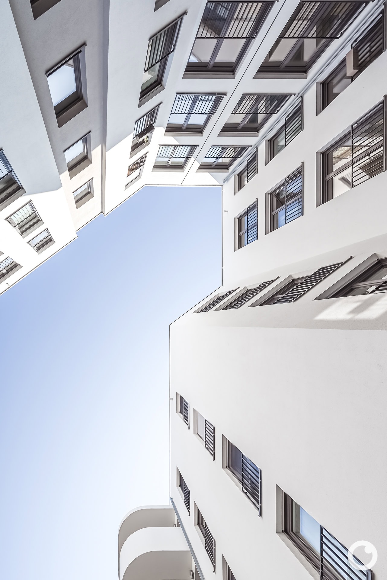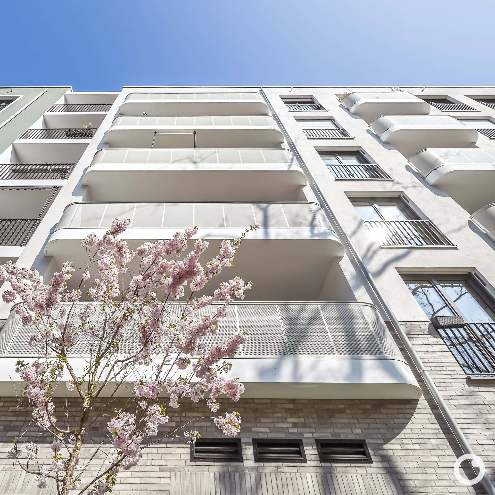 Die Wohnanlage besticht durch ihre klare, urbane Architektursprache und die markant geschwungenen Balkone, die an die Formensprache der 1970er-Jahre erinnern – zugleich modern interpretiert. Das Zusammenspiel von weißen Fassadenflächen, feiner Gliederung und zurückhaltenden Farbakzenten vermittelt eine elegante Ruhe. Im Innenhof öffnet sich der Bau zu einem hellen, gemeinschaftlich nutzbaren Raum, der Aufenthaltsqualität schafft und den Bewohnern geschützte Freiflächen bietet.
