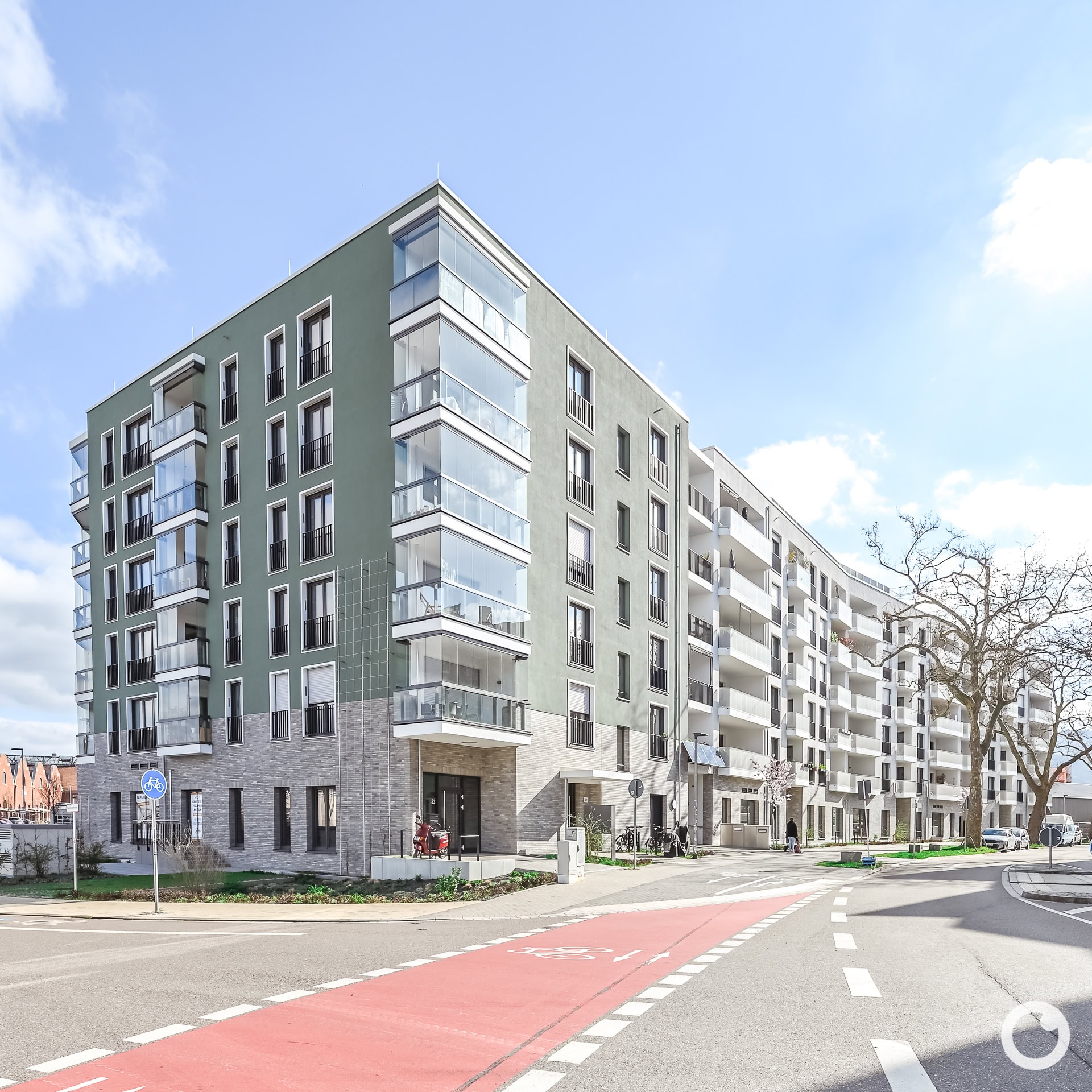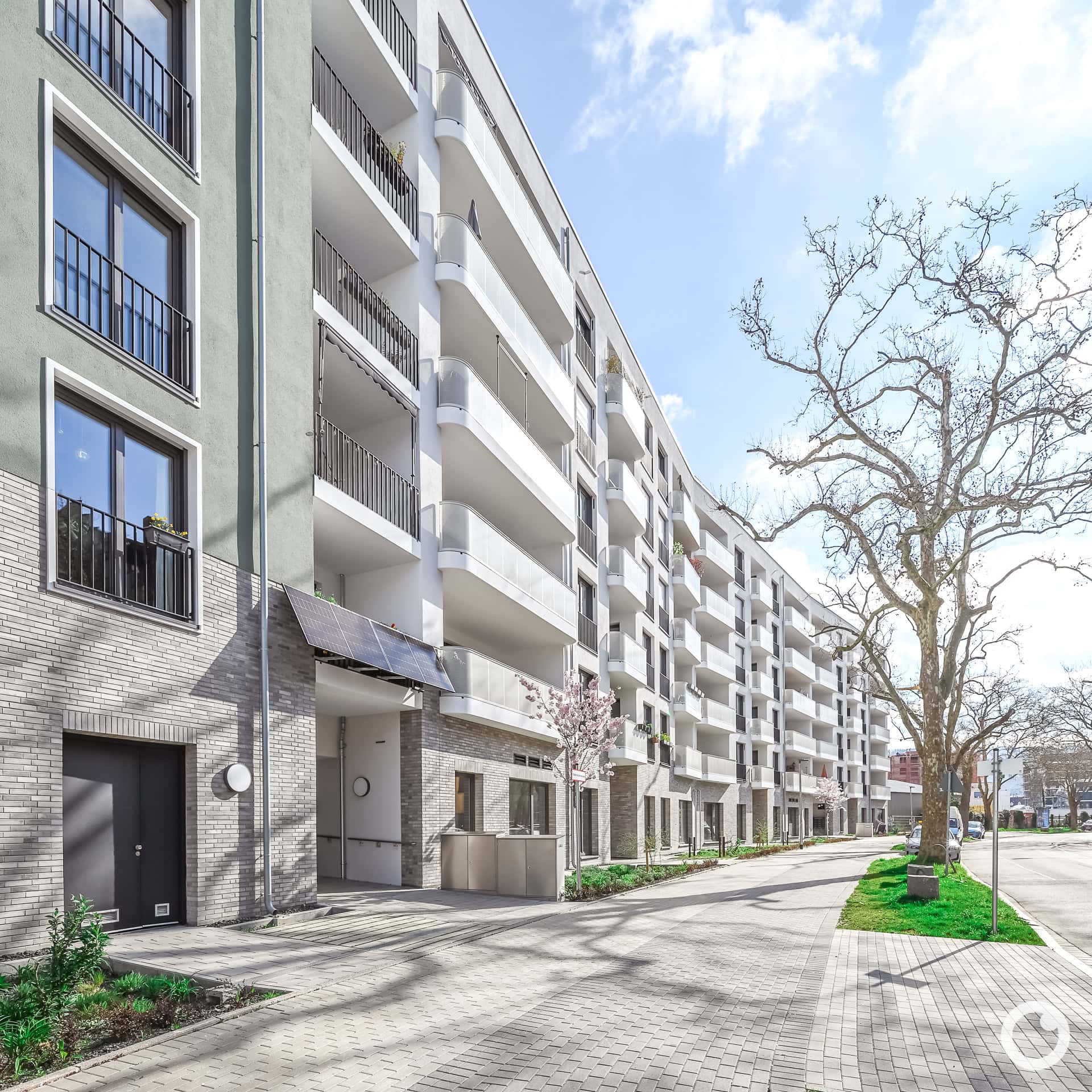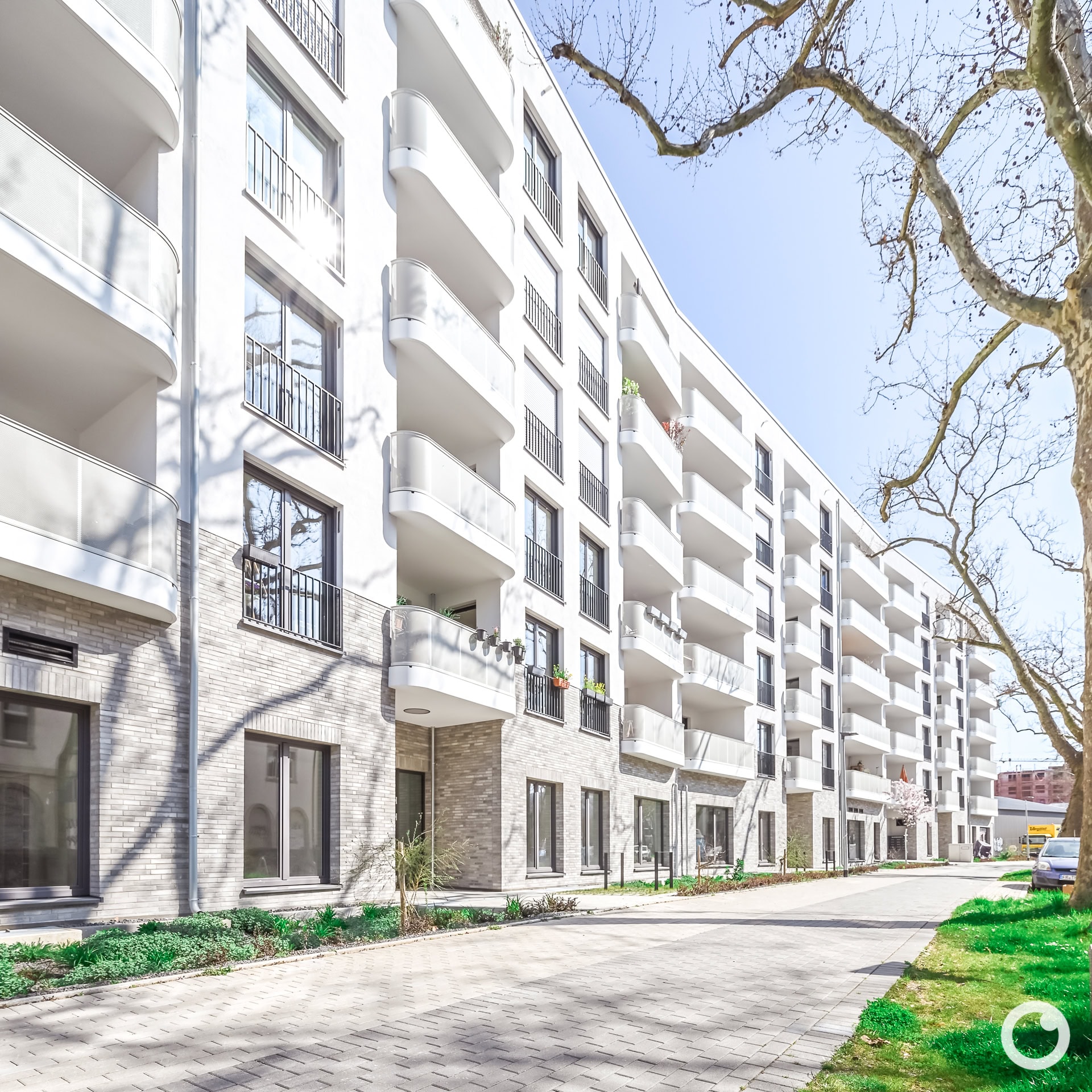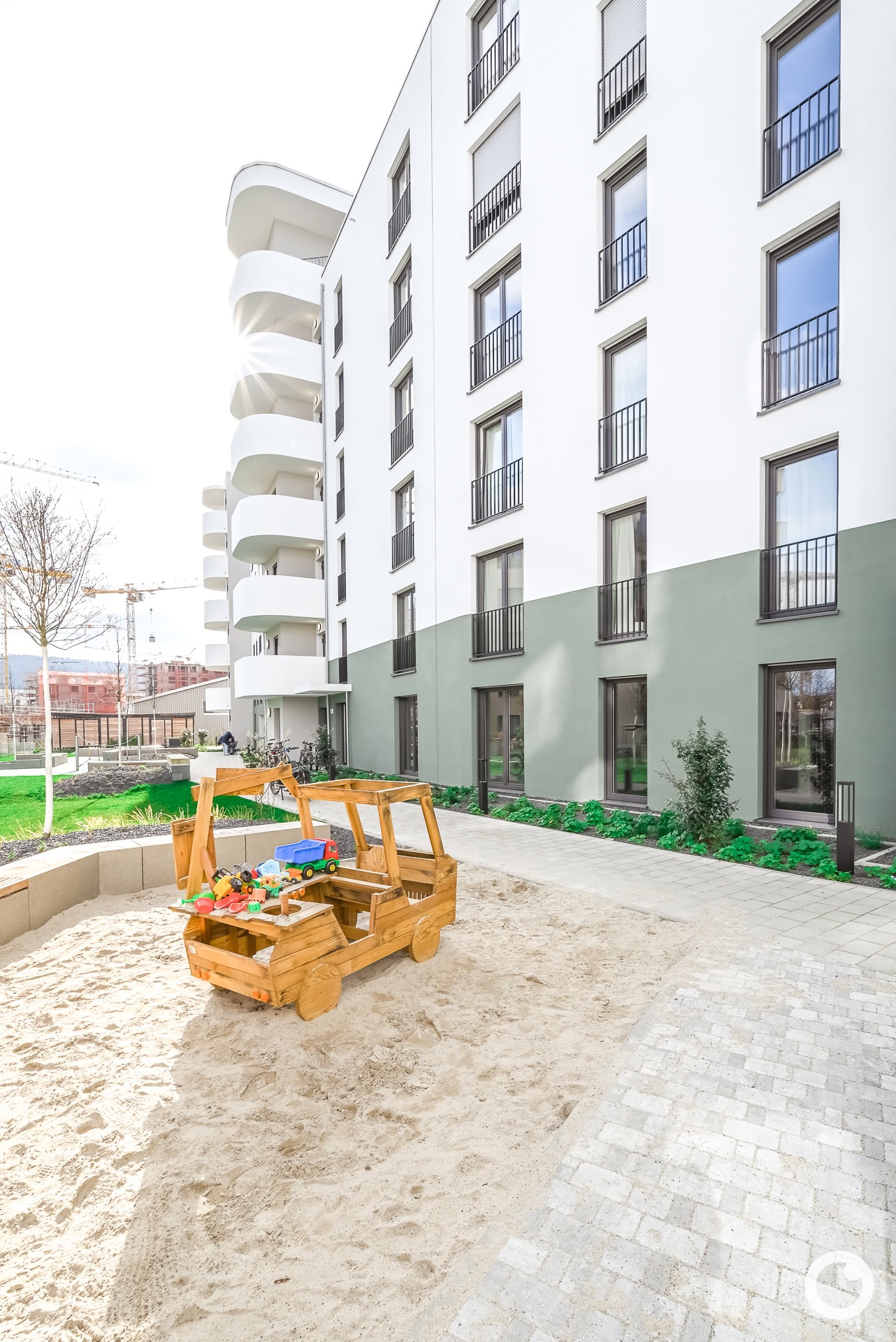 Die Wohnanlage besticht durch ihre klare, urbane Architektursprache und die markant geschwungenen Balkone, die an die Formensprache der 1970er-Jahre erinnern – zugleich modern interpretiert. Das Zusammenspiel von weißen Fassadenflächen, feiner Gliederung und zurückhaltenden Farbakzenten vermittelt eine elegante Ruhe. Im Innenhof öffnet sich der Bau zu einem hellen, gemeinschaftlich nutzbaren Raum, der Aufenthaltsqualität schafft und den Bewohnern geschützte Freiflächen bietet.