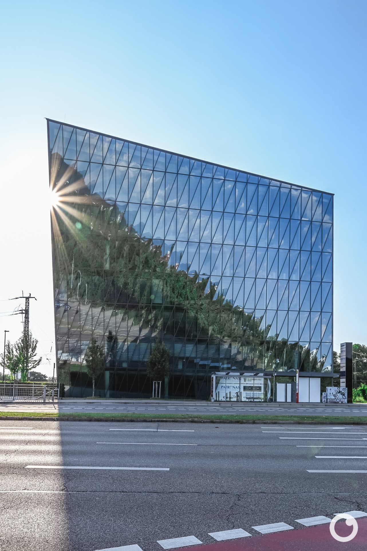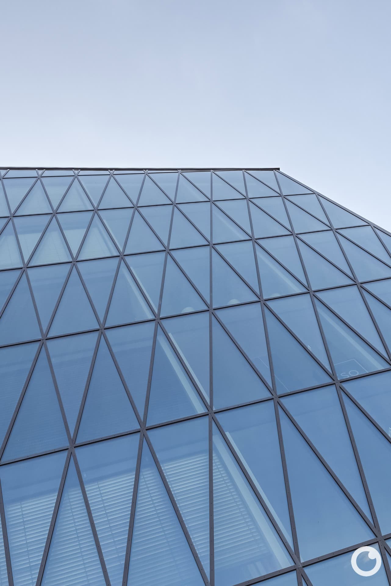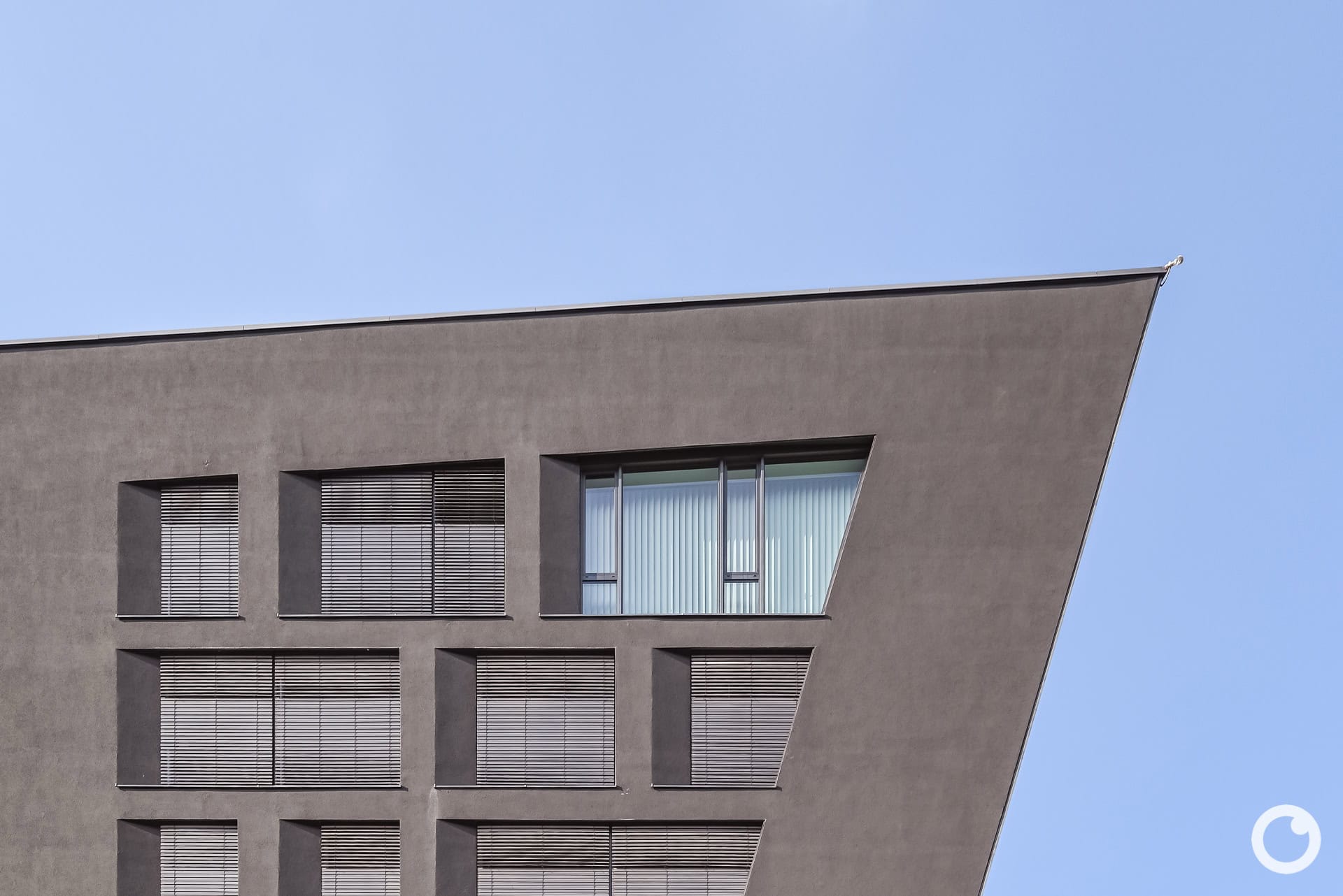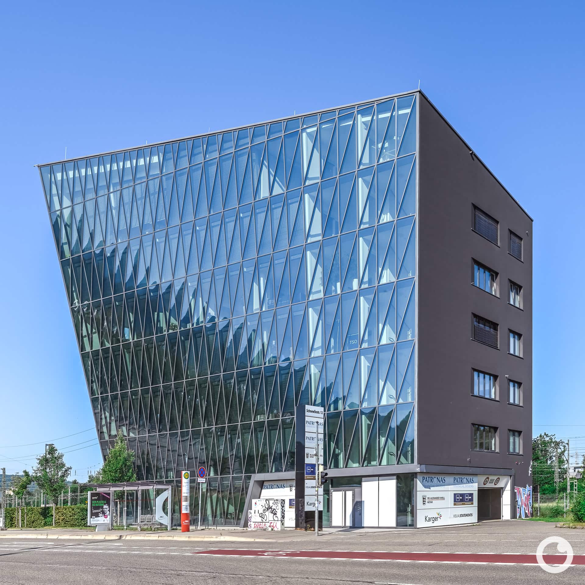Mit seiner hyperbolisch-paraboloiden Stahl-Glasfassade wirkt das siebengeschossige Bürogebäude wie ein geschliffener Kristall. Die zur Schnewlinstraße orientierte, zweifach gekrümmte Glasfront und die markante Überkragung von fast sieben Metern auf 27 Metern Höhe machen den Bau zu einem weithin sichtbaren Landmark.