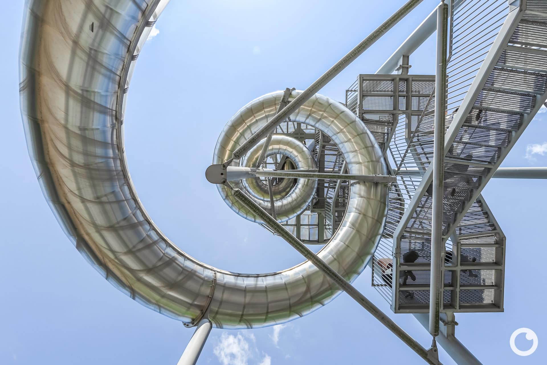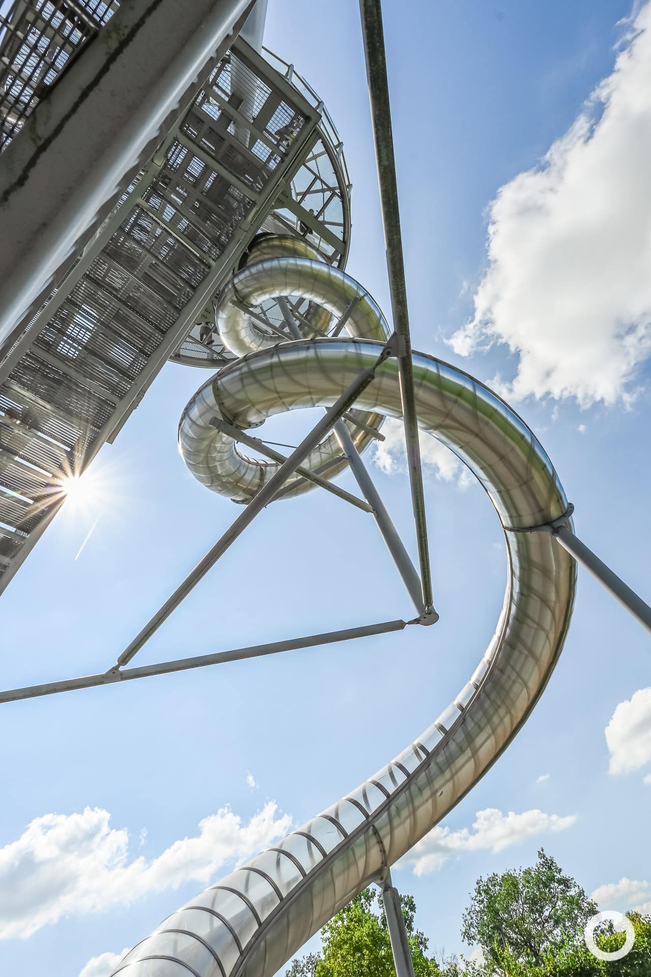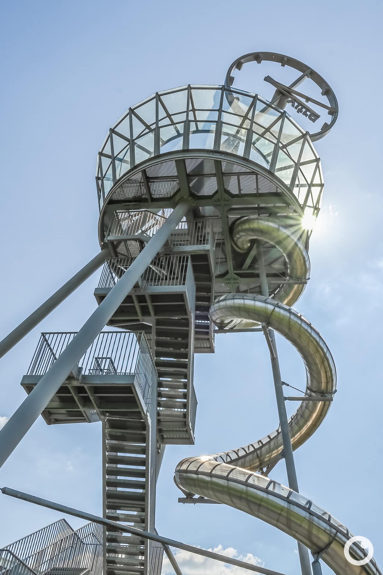 Besonderheiten: 30,7 Meter Höhe, sechs Meter große Uhr, 38 Meter lange Spiralenrutsche