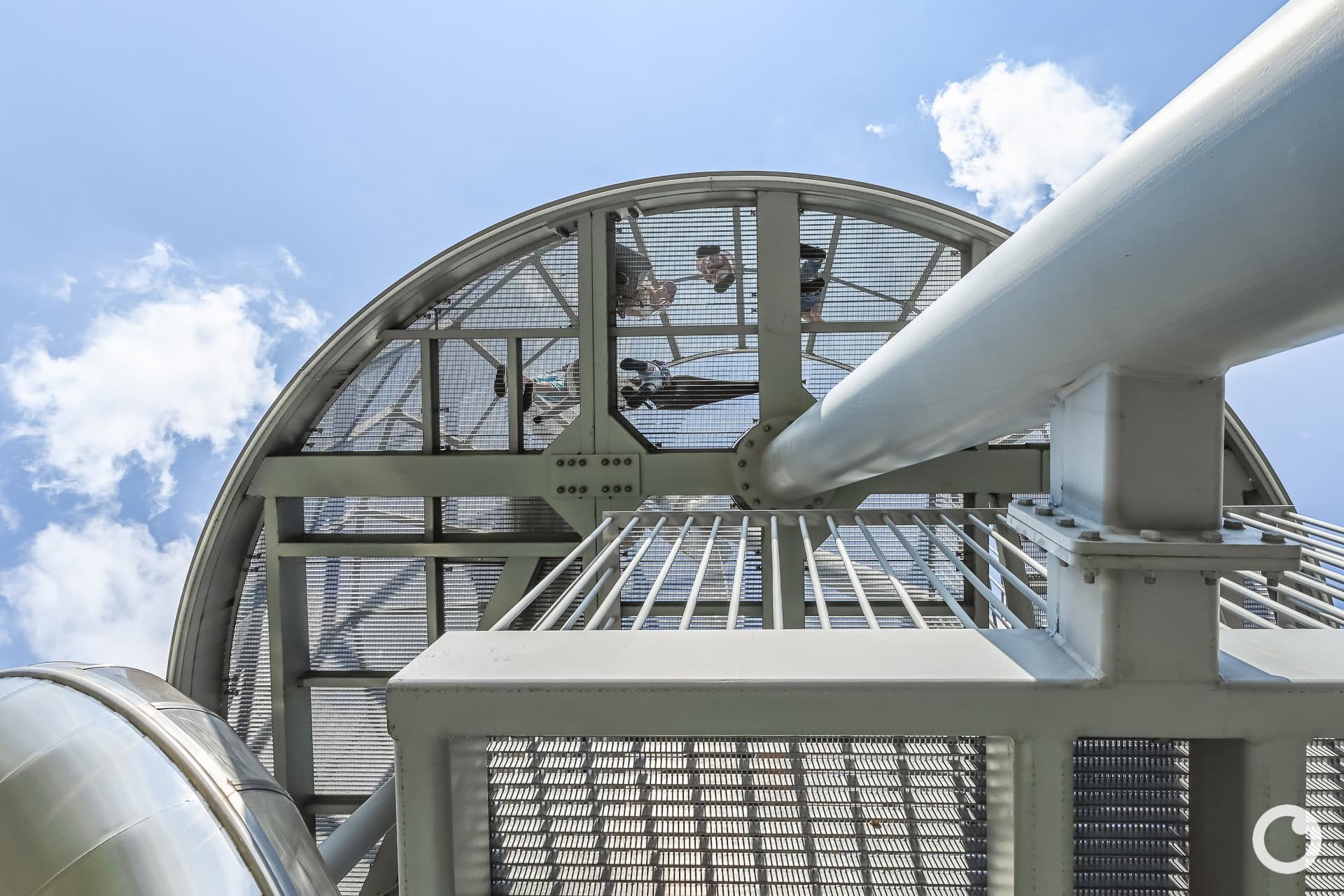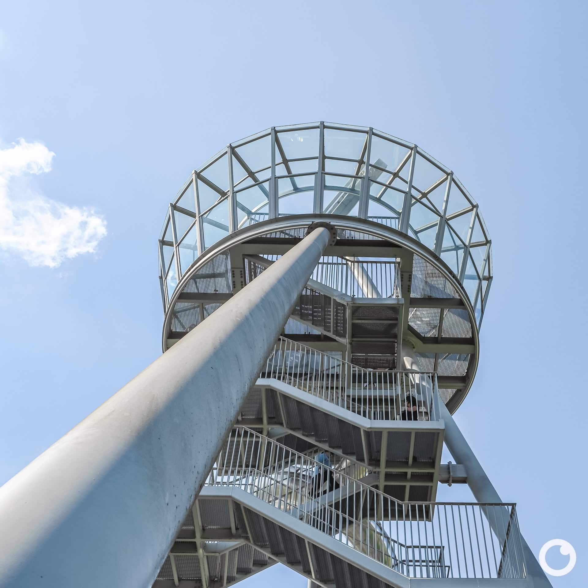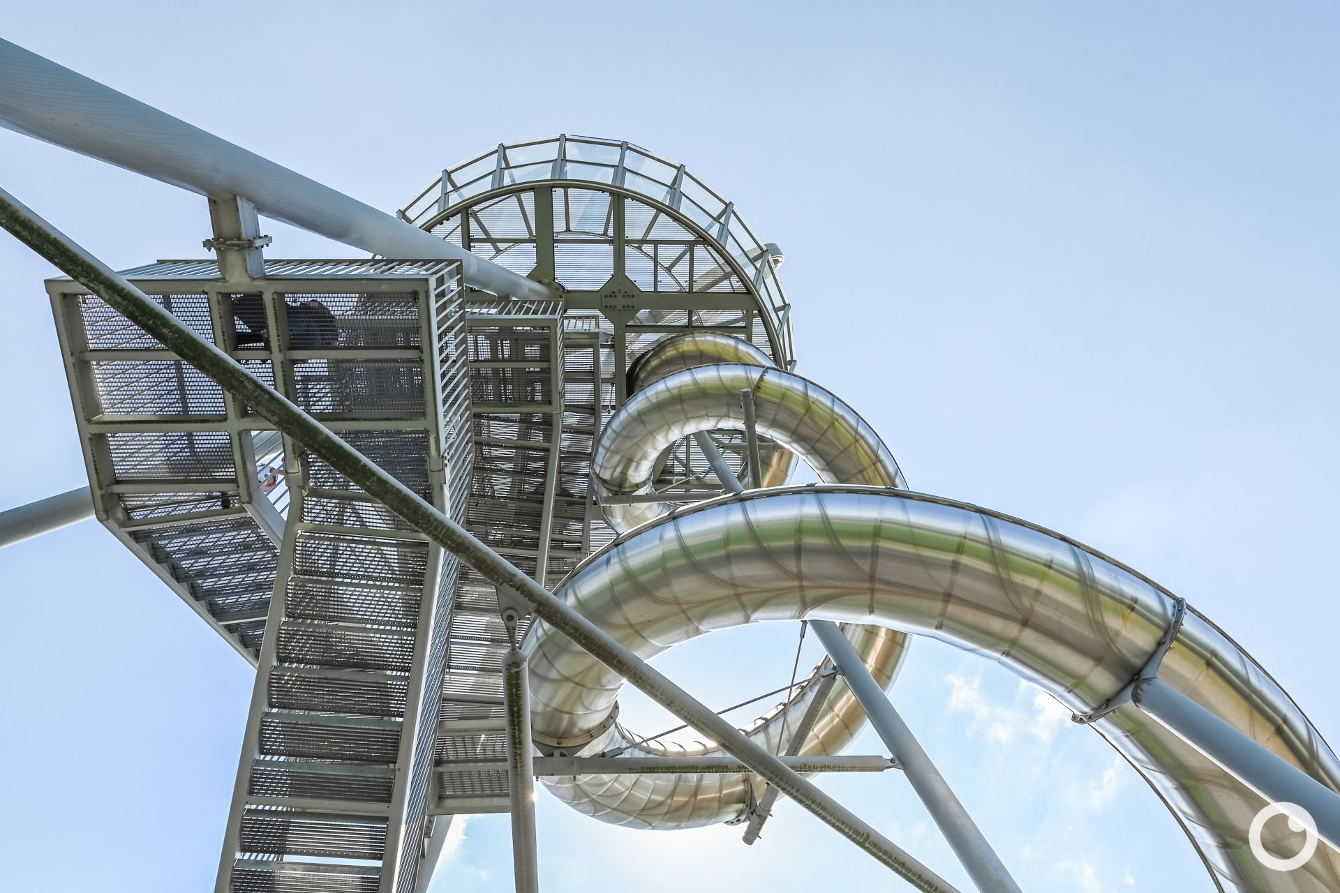 Der 30,7 Meter hohe Vitra Rutschturm von Carsten Höller ist Aussichtsturm, Uhr, Kunstwerk und Erlebnisrutsche zugleich. Drei schräg stehende Stahlstützen tragen die Konstruktion, auf 17 Metern Höhe öffnet sich eine Plattform mit weitem Blick über den Campus und das Umland. Von hier führt eine 38 Meter lange Spiralenrutsche zurück nach unten – ein spielerischer Kontrast zur strengen Stahlarchitektur. Besonders markant ist die sechs Meter große Uhr, die den Schnittpunkt der Stützen betont und dem Turm eine skulpturale Note verleiht. Beim Fotografieren verband sich die klare Ingenieursästhetik mit der kindlichen Freude des Rutschens – eine Mischung, die diesen Ort einzigartig macht.